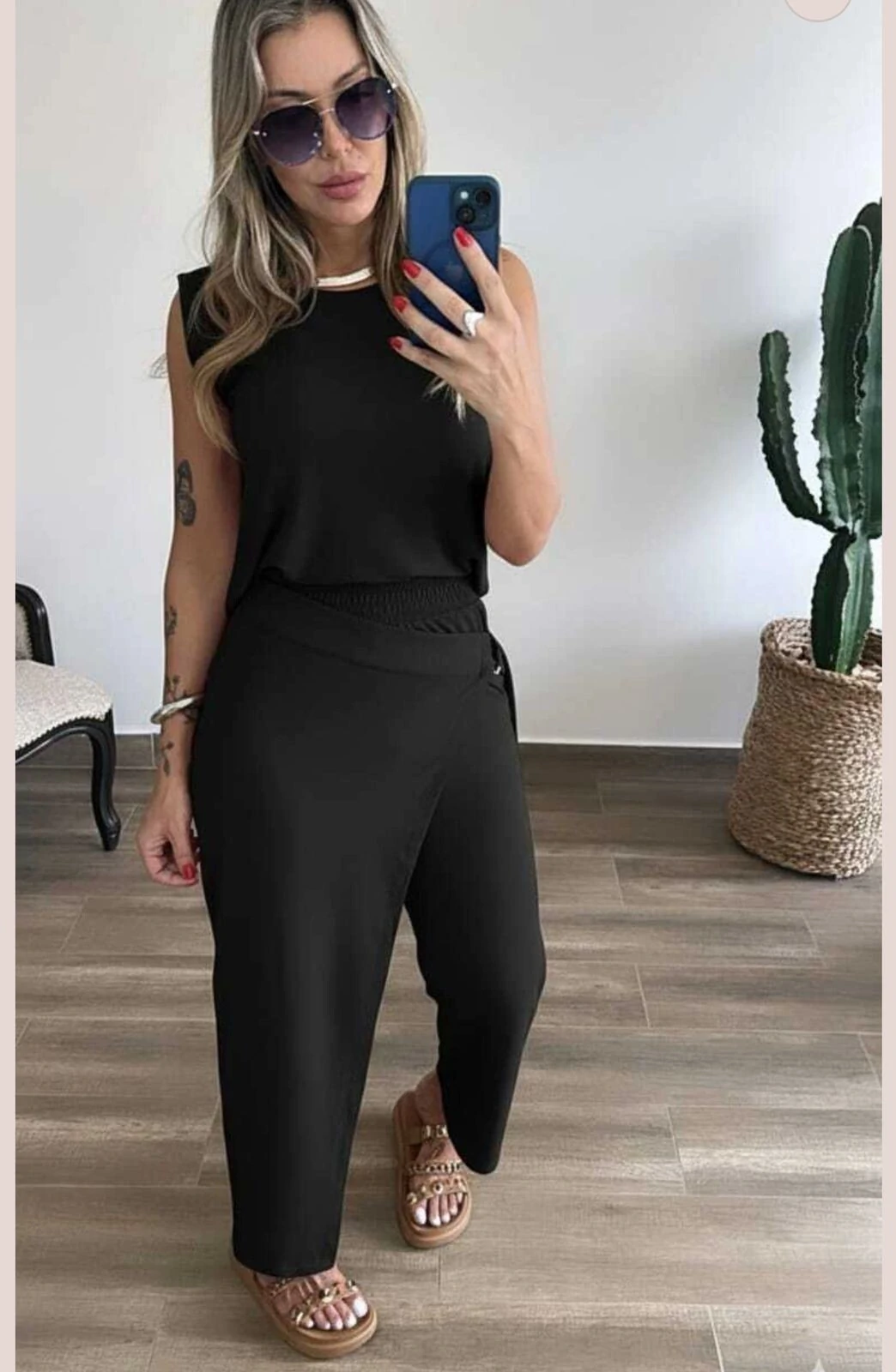 Confeccionado em moletinho de alta qualidade, ele é composto por blusa muscle com caimento moderno e calça pantacourt transpassada, que valoriza a silhueta e traz um toque de elegância casual.