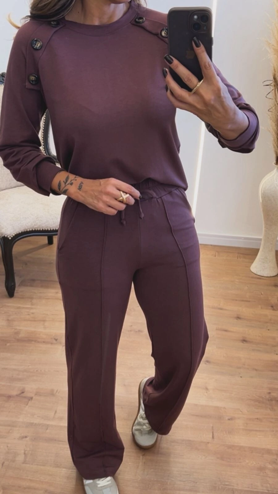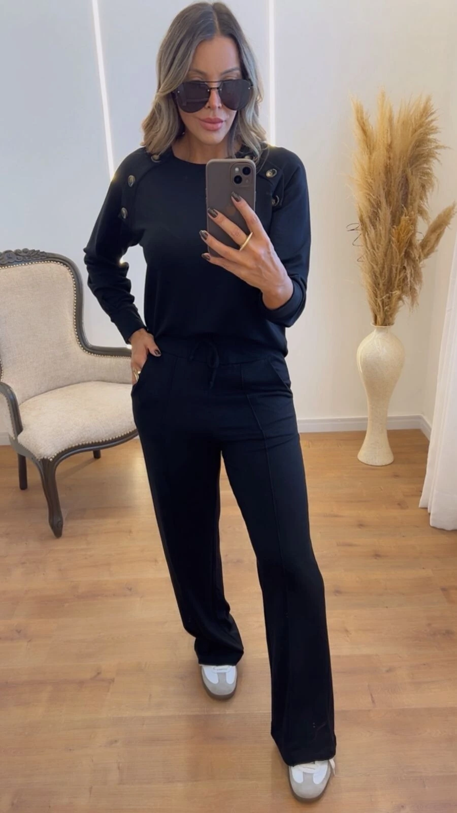 Com uma blusa de modelagem solta e calça com corte reto e elástico na cintura, esse conjunto é perfeito para composições casuais, produções mais arrumadas ou até mesmo para viagens – sempre com muito conforto e estilo.