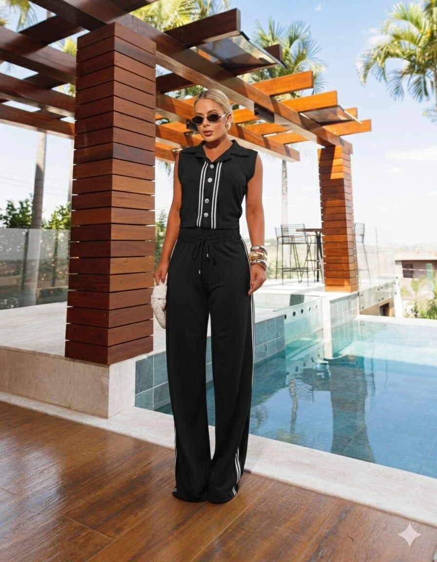 O conjunto é composto por colete estruturado com botões frontais, que valoriza a silhueta e traz sofisticação ao look, e calça pantalona de cintura alta, que alonga a silhueta e garante elegância em qualquer ocasião.