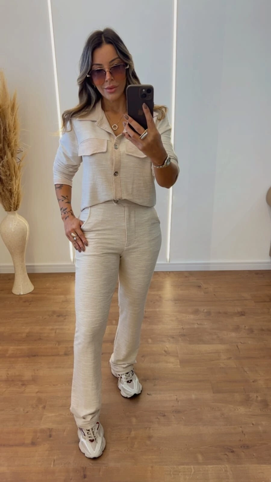 Confeccionado em moletinho aspen (tricô), o conjunto possui toque macio, caimento impecável e uma leve textura sofisticada que eleva a produção, mesmo sendo uma proposta casual.