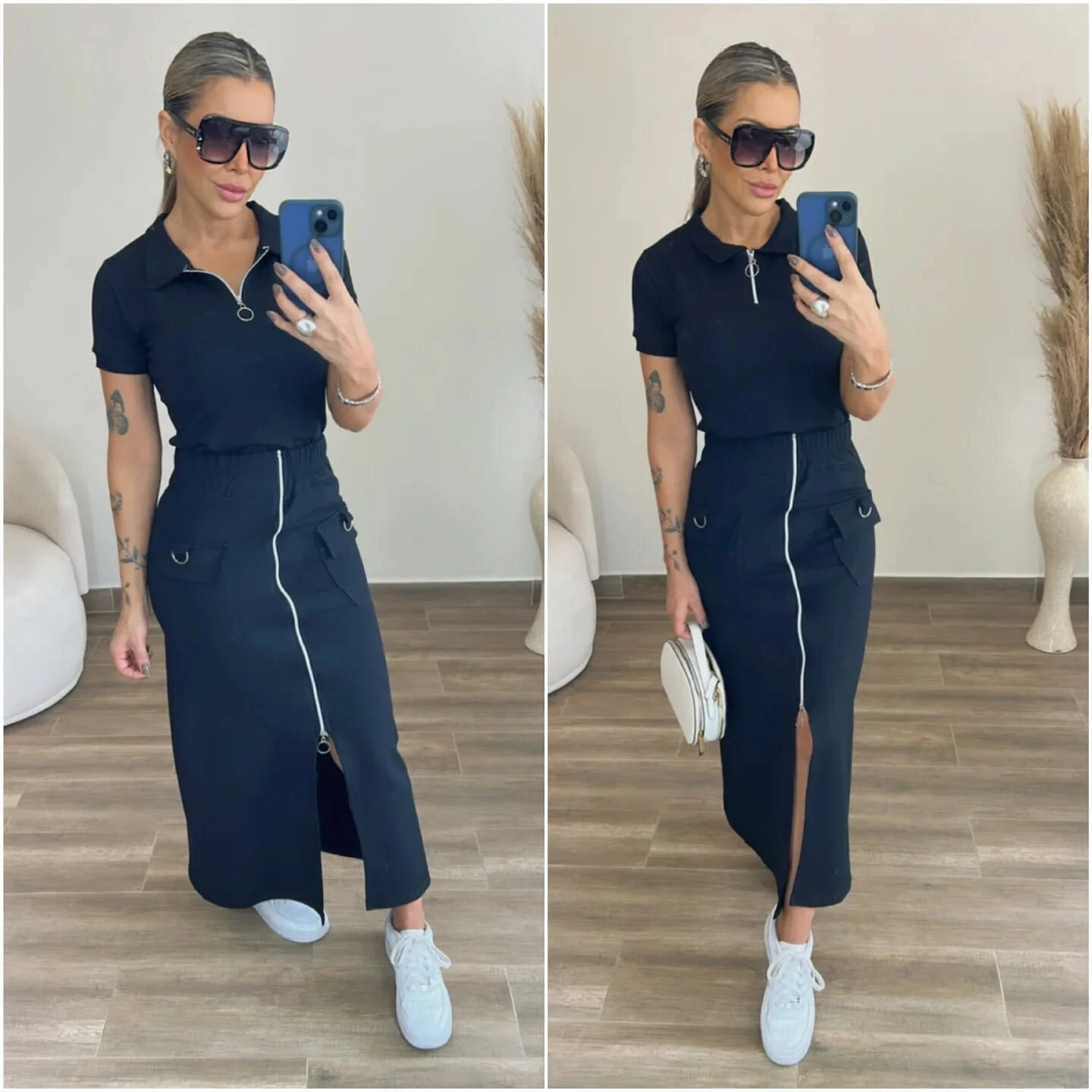 Saia midi com bolsos cargo frontais e fenda frontal com zíper, que proporciona praticidade e um toque fashion ao look.