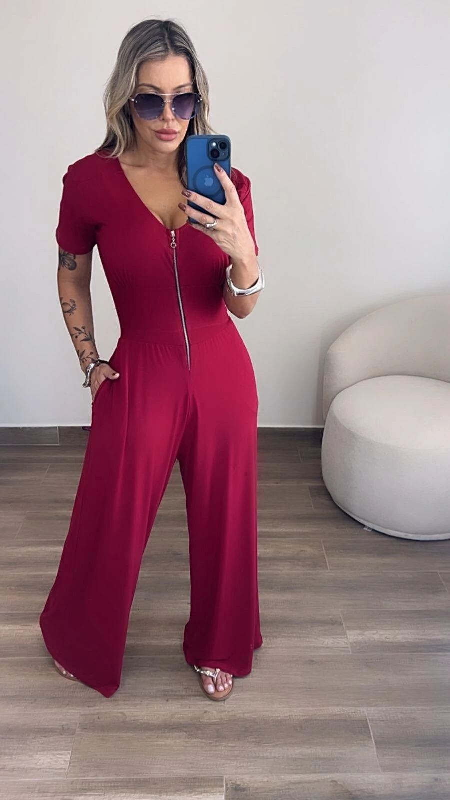 Seu design conta com pala frontal que valoriza o visual, elástico nas costas para ajuste perfeito à cintura, bolsos funcionais que trazem praticidade, decote V que alonga a silhueta e fechamento em zíper para mais facilidade ao vestir. O modelo pantalona garante um caimento fluido e moderno, ideal para compor looks tanto para o dia quanto para a noite.
