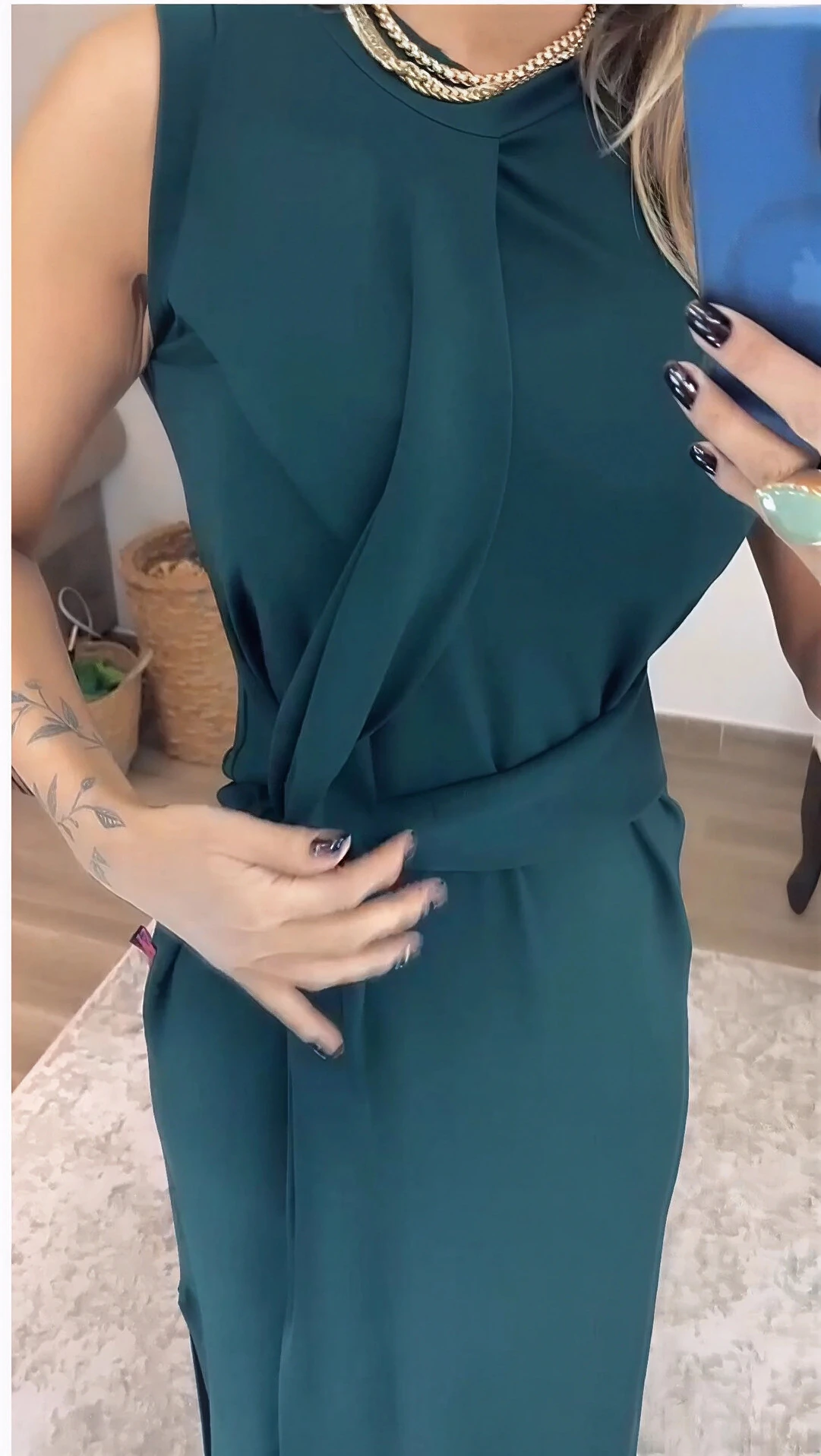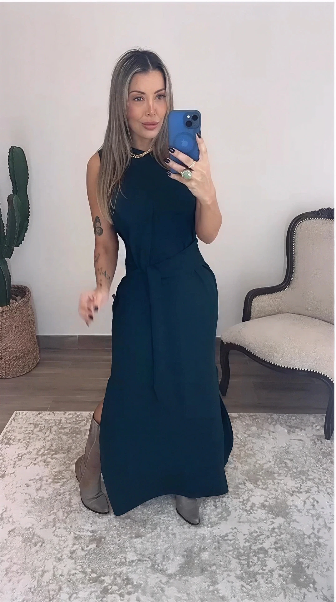 Seu modelo midi conta com fendas laterais que trazem movimento, enquanto o detalhe de amarração adiciona um toque exclusivo e moderno à peça. Com gola redonda e alças regatas, é ideal para looks casuais, passeios ou momentos especiais.