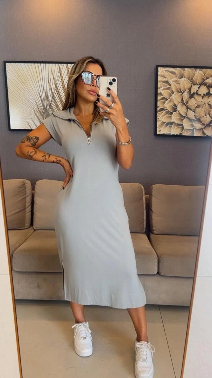 Seu comprimento midi traz sofisticação, enquanto as pequenas fendas laterais garantem leveza e liberdade de movimento, deixando o visual feminino e atual. A gola com fechamento em zíper é o detalhe que faz toda a diferença, permitindo ajustar o decote conforme a ocasião e acrescentando um charme moderno à peça.