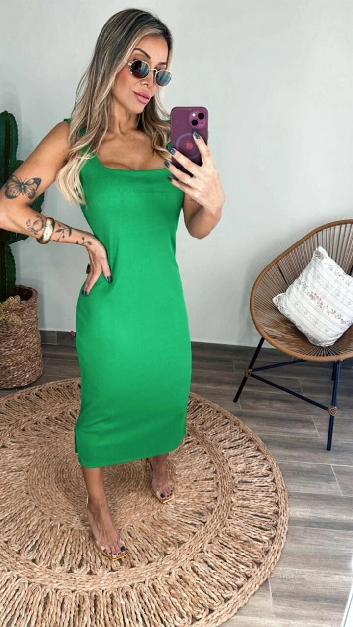 Seu comprimento midi traz elegância e sofisticação, ideal para quem busca uma peça que transita bem entre o dia e a noite. O decote em quadrado alonga o colo, complementado por uma fenda lateral que garante mobilidade e estilo.